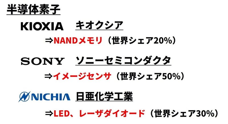キオクシア、ソニー、日亜、ロームが強みを持つ半導体素子。