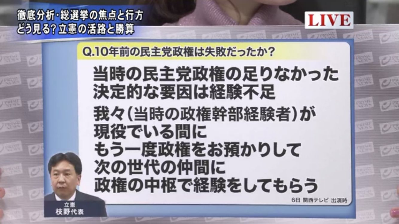 10年前の民主党政権は失敗だった?立憲民主党・枝野幸男「我々が現役でいる間にもう一度お預かりして次世代の仲間に政権の中枢で経験してもらいたい」